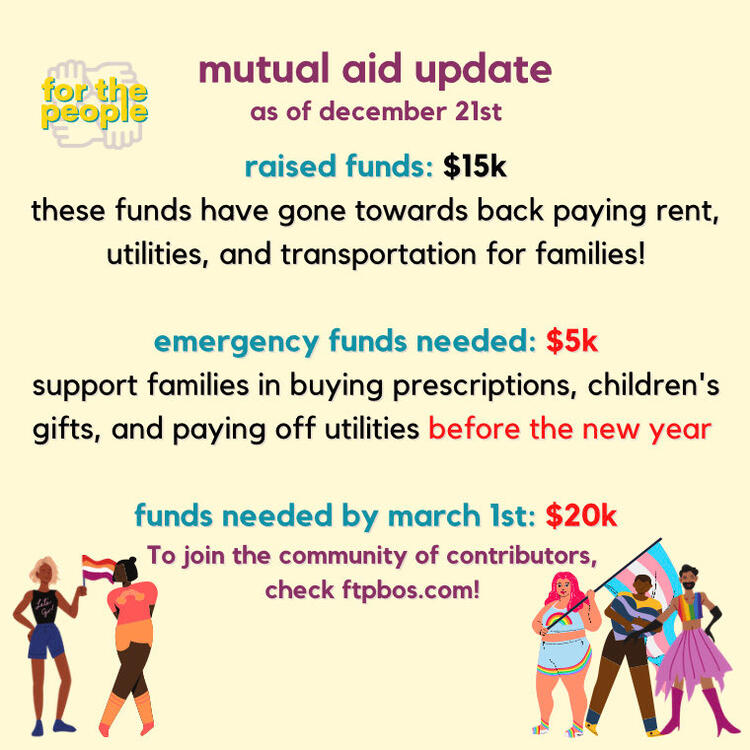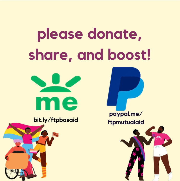 mutual aid is a political framework of participation that is grounded in ideas of solidarity, community care and anti-capitalism. it asks us to think about how we can support one another without transactional gain or savior mentalities, looking at one another with humanity in our everyday lived experiences and struggles. at its simplest, it's community caring for communtiy.one of our core values as a collective is transparency. in keeping with this value we would like to announce that, as of april 27th, the FTP Mutual Aid Fund is officially pausing temporarily. we will no longer be taking requests past april 27th. 'any further funds we receive will be put towards fulfilling the $45,000 in the 18 remaining requests we have in our database. please consider donating.